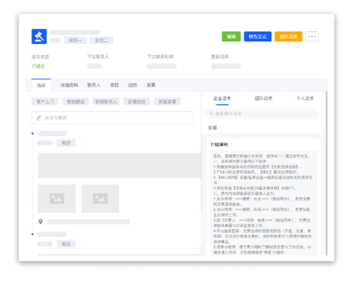 客户关系管理系统可以随时随地记录客户的沟通情况,挖掘潜在客户需求;支持配合外呼系统一键外呼,让您省去手动拨号的烦恼;智能话术库让你更精准的了解行业客户的需求,促使沟通更加顺畅;为记录客户的每一笔回款,客户续签有依据,销售业绩有体现。