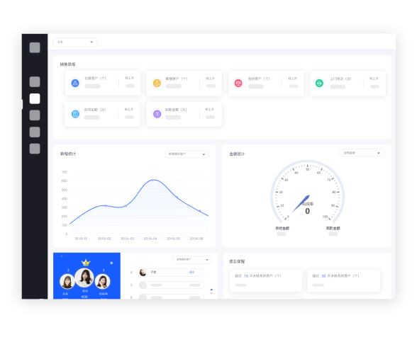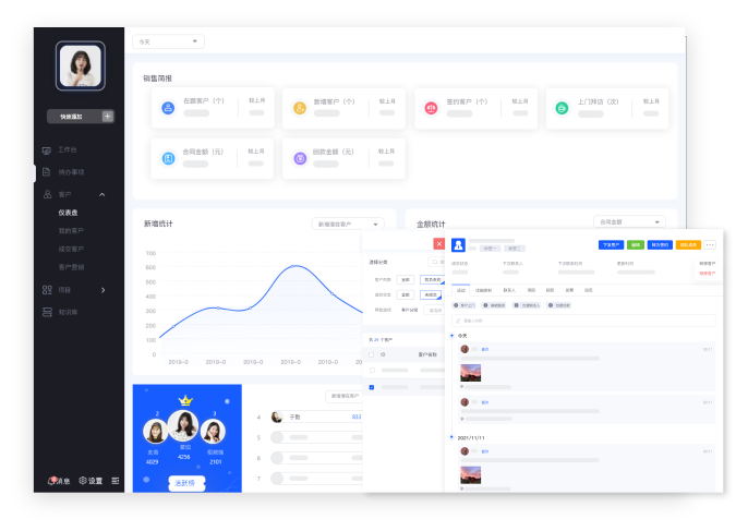 统计个人的客户新增情况、跟进情况、签约情况、数据排行榜等,可以快速了解自己的客户数据,分析自身的弱项,提升业务拓展能力。