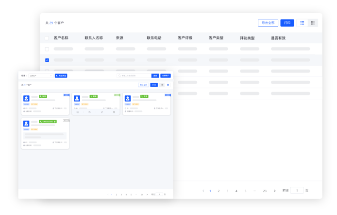 在CRM客户模块中,您可以快速了解客户的全景信息,包活:基本信息、客户联系人、签约信息、项目信息、回款、发票等,支持一键导入个人客户,建立跟进计划、智能跟进、客户字段自定义、智能话术库等管理工具。