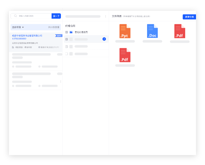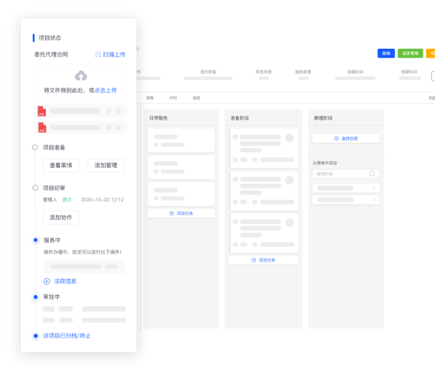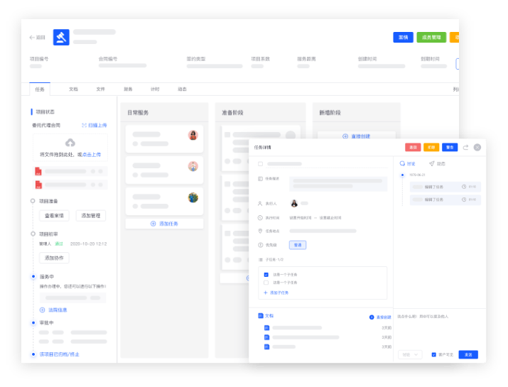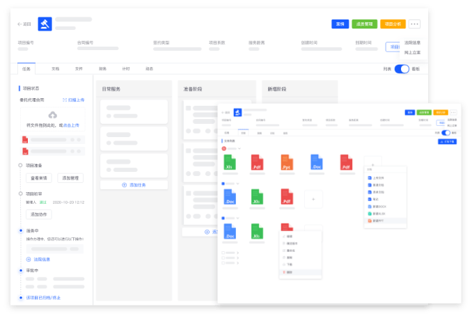 使用项目管理的形式将法律服务流程可视化的体现,服务人员可根据服务流程服务客户,还可以分享给客户实时查看自己的服务进度;项目管理中我们会将文档由服务人员上传或者使用律者在线文档,随时随地都可以进行文书的编写,云端保存电子卷宗;服务人员可以在项目中发起讨论,解决项目中的疑难问题。