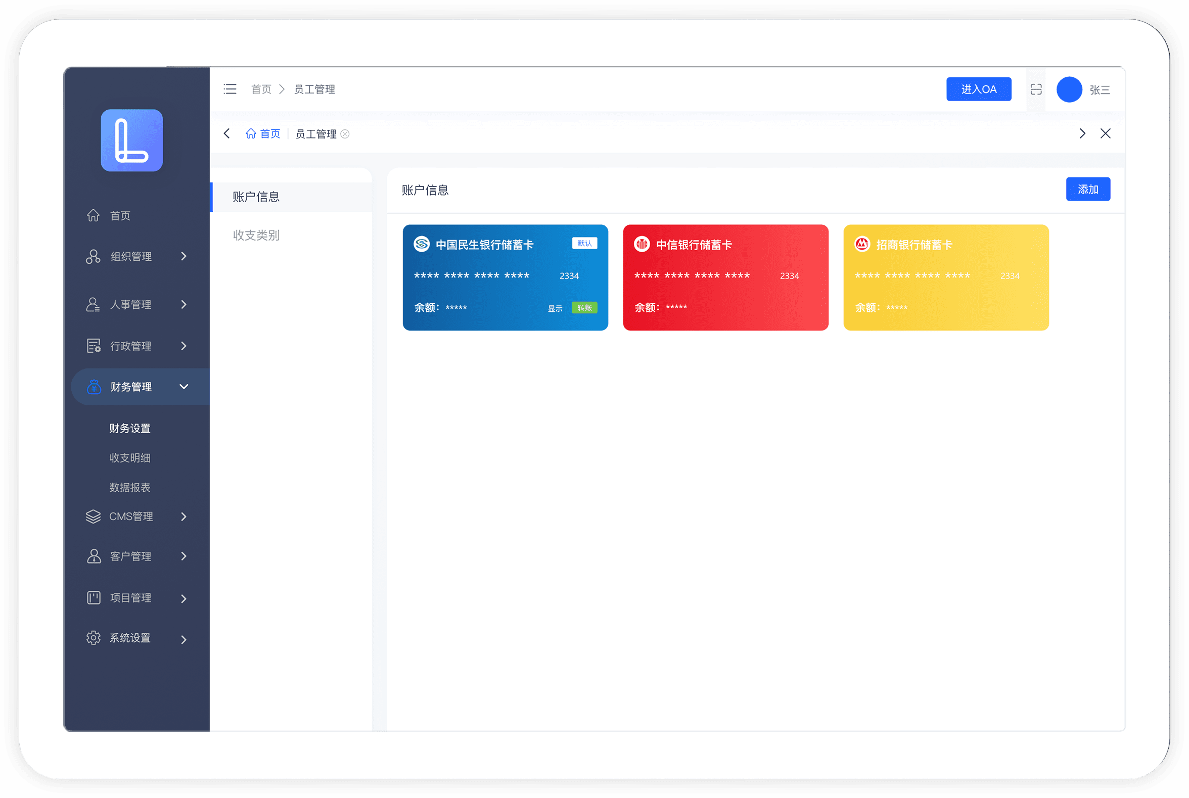 财务管理系统主要应用于项目的回款和一些收支记录,每收到一笔款项都可以记录到系统中,并对该款项进行核算,落实该款项的受益人。并且提供了财务信息统计和业务人员的业绩核算功能。