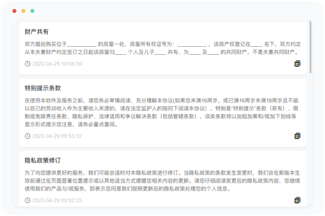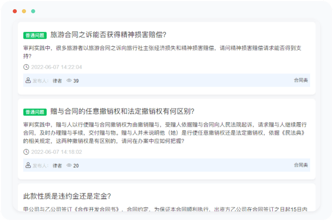 系统内置了5000+常见的法律问答,问答内容由专业的律师进行整理,包括了问题回答内容、法律依据、以及参考案例,让你的团队即使是小白也能学习到很多法律知识,并成功为企业开拓出新的客户。
