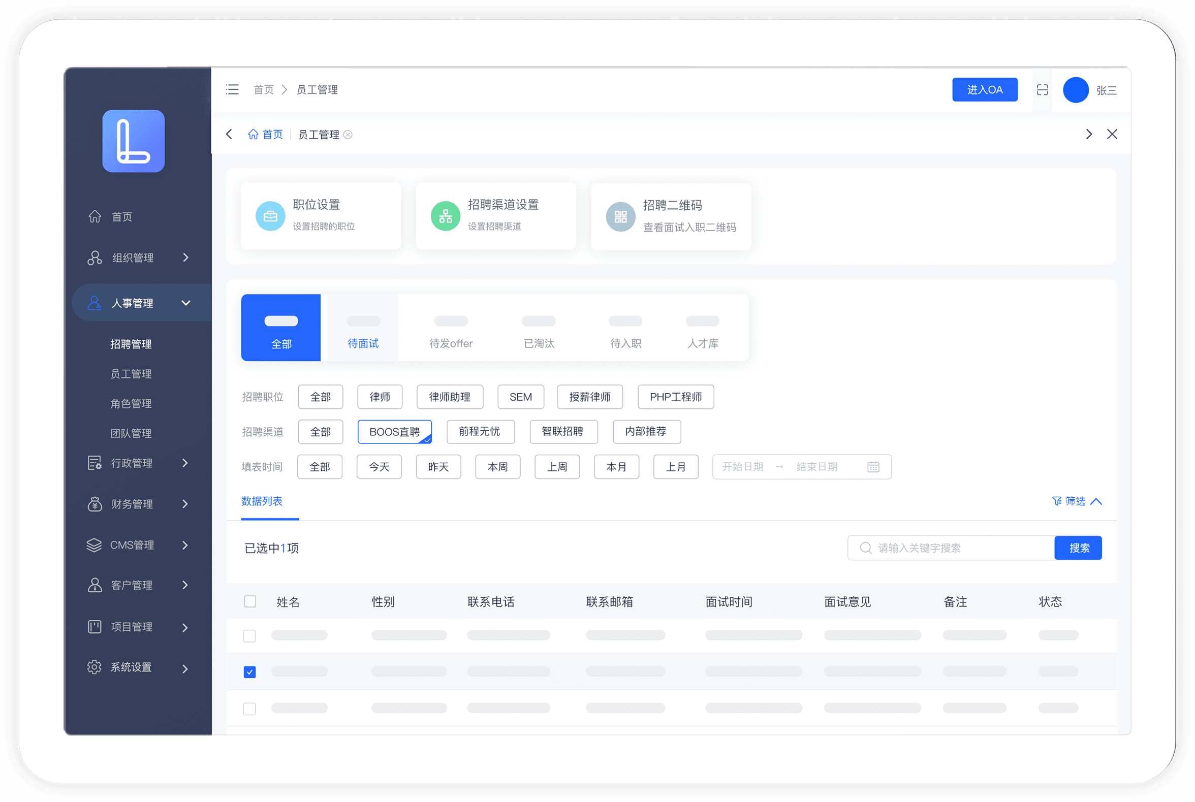 人事系统包含了招聘管理和员工管理,面试者可以通过二维码的形式扫码填写简历,公司内部人员可以分享电子简历给面试官,快速的提高面试效率,当面试的人员通过后可以从系统中快速建立人事档案,人事系统对接了企业微信,会自动为员工开通企业微信。员工管理包括入职、转正、离职、复聘、人事档案管理,劳动合同管理等,可以让企业全面的管理员工。