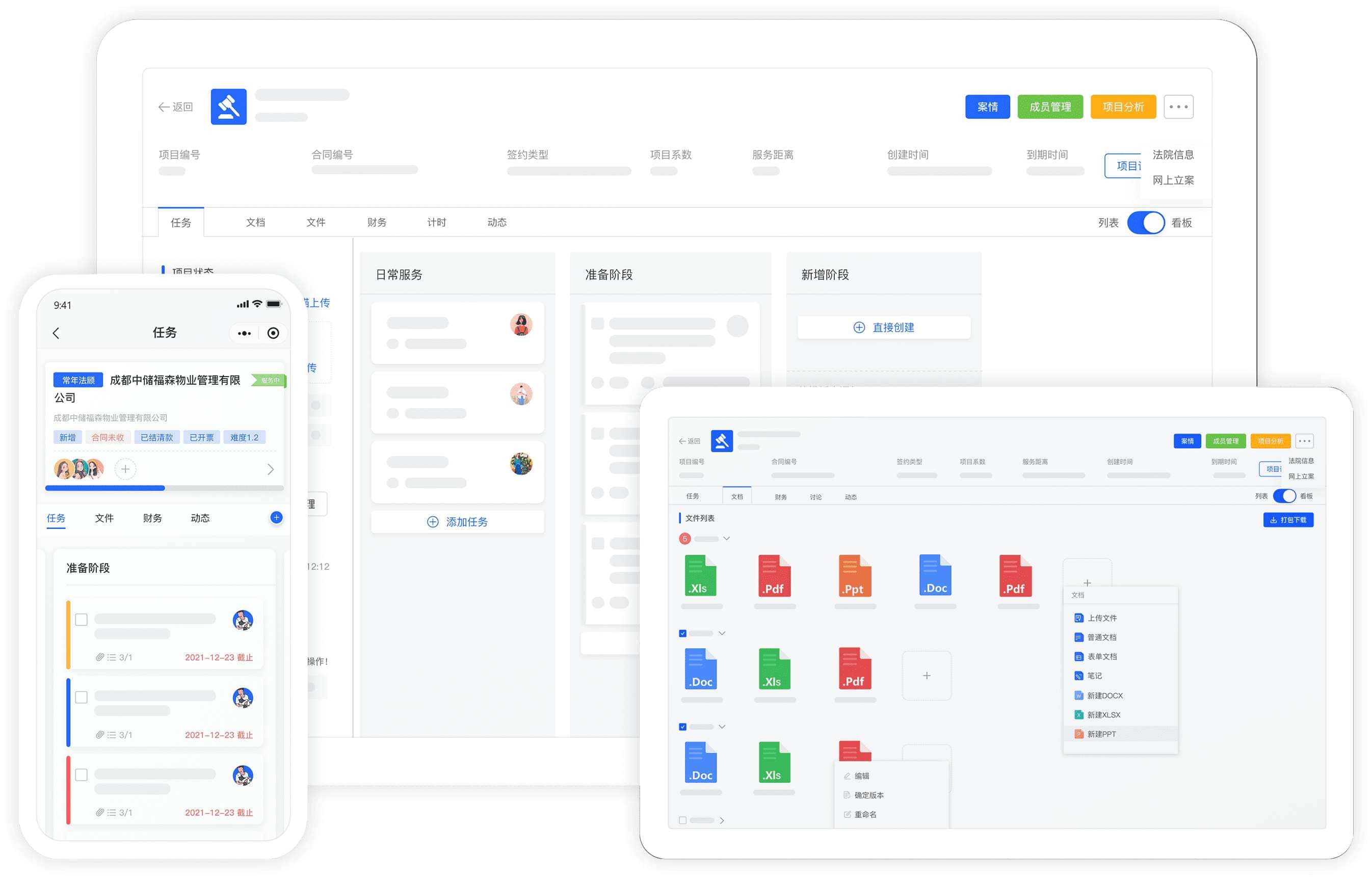 使用项目管理的形式将法律服务流程可视化的体现,服务人员可根据服务流程服务客户,还可以分享给客户实时查看自己的服务进度;项目管理中我们会将文档由服务人员上传或者使用律者在线文档,随时随地都可以进行文书的编写,云端保存电子卷宗;服务人员可以在项目中发起讨论,解决项目中的疑难问题。