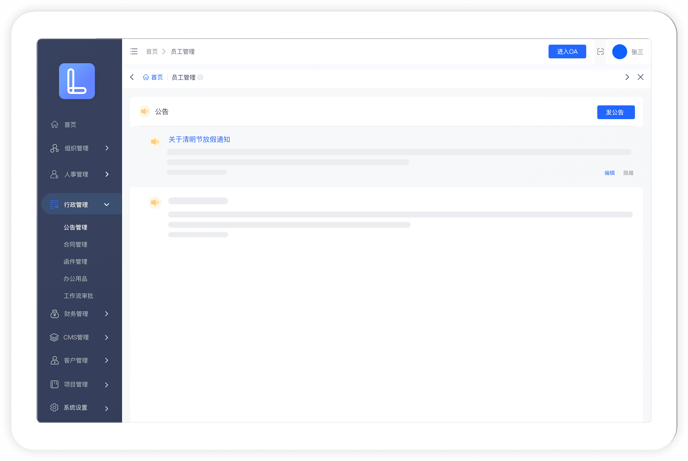 行政管理包含了发公告,办公用品管理,固定资产管理,合同管理,工作流审批等;员工可以通过审批应用领取办公用品,可视化的了解办公成本;固定资产管理有效保护了企业的资产,为每一个企业资产生成一个二维码,扫码即可了解资产的使用情况。合同管理包含了委托合同和业务合同,不管我们是作为甲方还是乙方,都能管控到每一个合同的履行情况。工作流审批管理可以快速为企业建立审批流程,实现办公无纸化,提升领导审批效率。