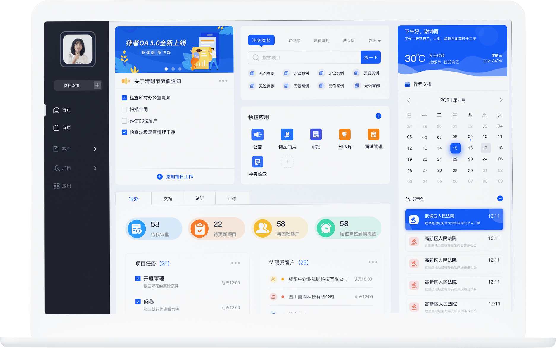 基于客户的管理工具 (该功能只有律者法务的合作企业使用公有云版本才能使用) 客户可以通过律者小程序查看自己的项目进度、法律产品、法律法规、文书模板以及法律咨询等功能